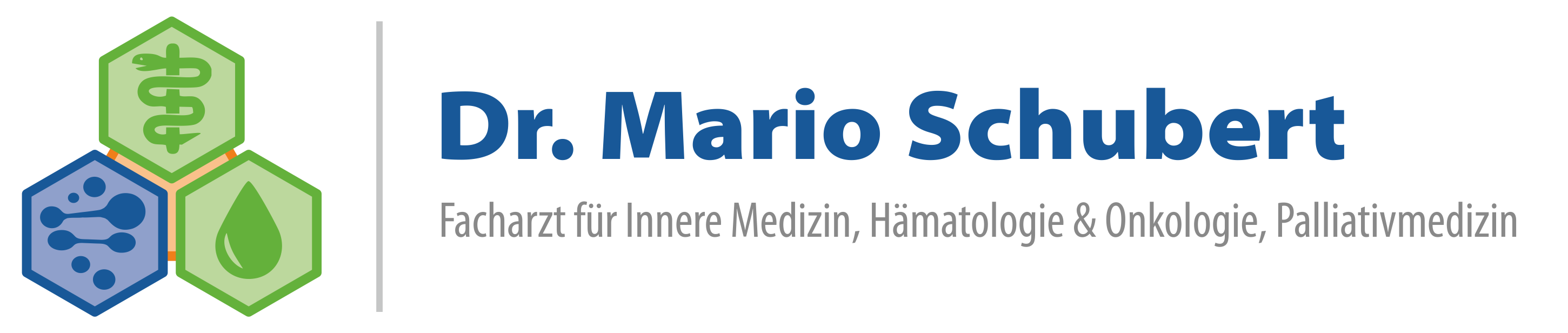 Die beiden grünen Waben stehen für die Fachgebiete Innere Medizin (mit dem Äskulap-Stab) und Hämatologie (mit dem Blutstropfen). Die blaue Wabe symbolisiert eine Krebszelle und zeigt die sehr markanten Form eines apoptotisch zerfallenen Zellkerns – das heißt, die Krebszelle ist am Absterben!